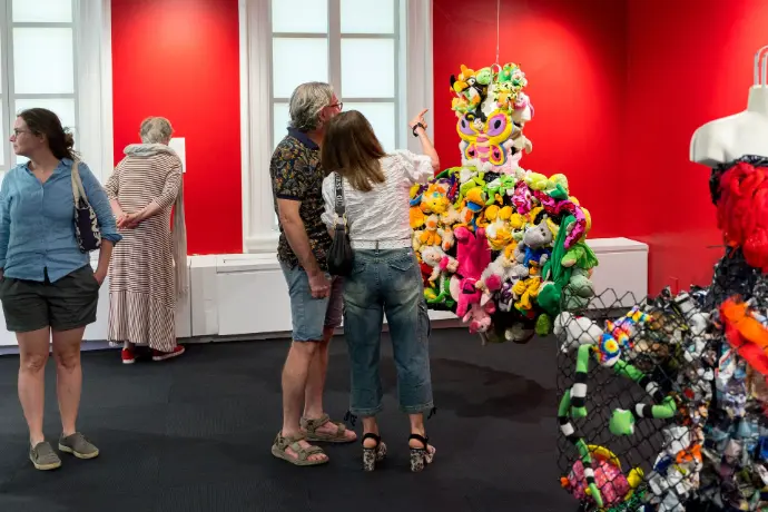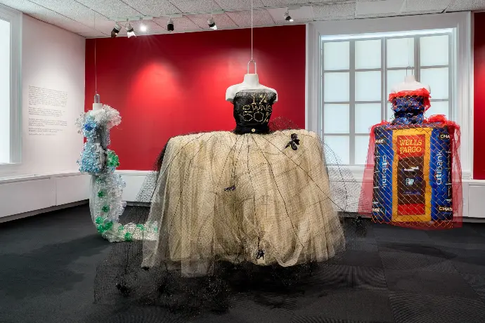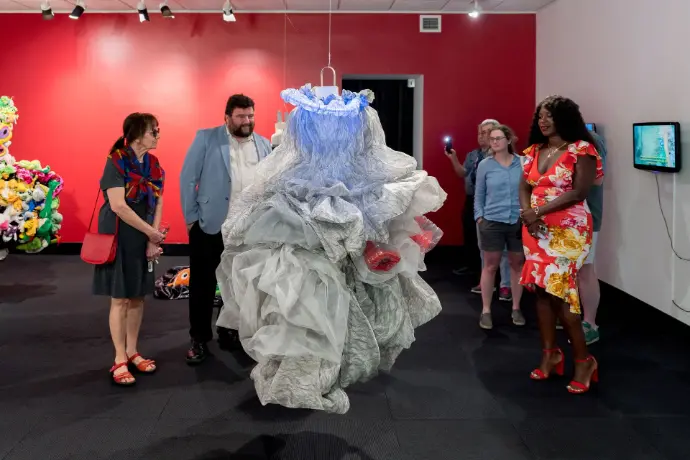 "Six classical singers, women from different backgrounds took turns showcasing portable structures designed by Dominique Paul in relation to current socio-economic and climate issues, while vocalizing and appropriating the libretto written by the artist, without any further musical accompaniment. An unusual yet enchanting critique of consumer society, this performance, which can be seen on video in the exhibition, entitled Rouge, shakes you up as much as it charms. Familiar opera arias carry words that echo the issues affecting our lives today. It's a challenge both for the professional classical singers (...) who step out of their normal routines, and for us, the viewers, who are swept up in an unprecedented experience that contrasts with our everyday lives."
